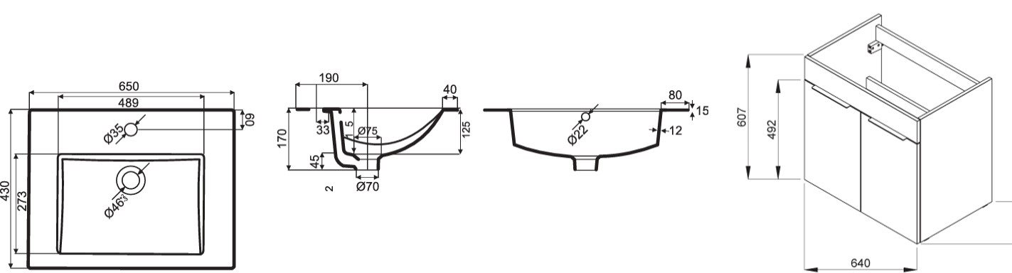 Underskabet leveres samlet med 2 skuffer og sorte greb. Skufferne har softclose. Møbelpakken måler 65 x 43 cm og er udført i en rengøringsvenlig, mathvid overflade.