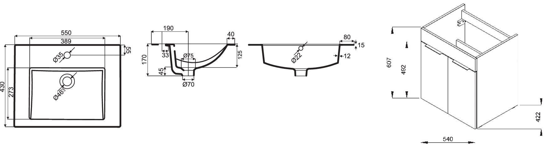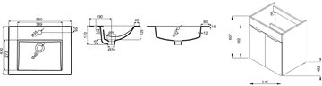 Underskabet leveres samlet med 2 skuffer og sorte greb. Skufferne har softclose. Møbelpakken måler 55 x 43 cm og er udført i en rengøringsvenlig, mathvid overflade.