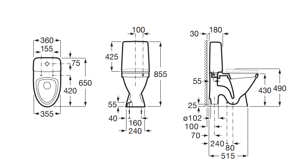 Vi anbefaler, at du har 80-110 cm foran toilettet, men hvis pladsen er begrænset, kan du gå ned til 60 cm foran toilettet.