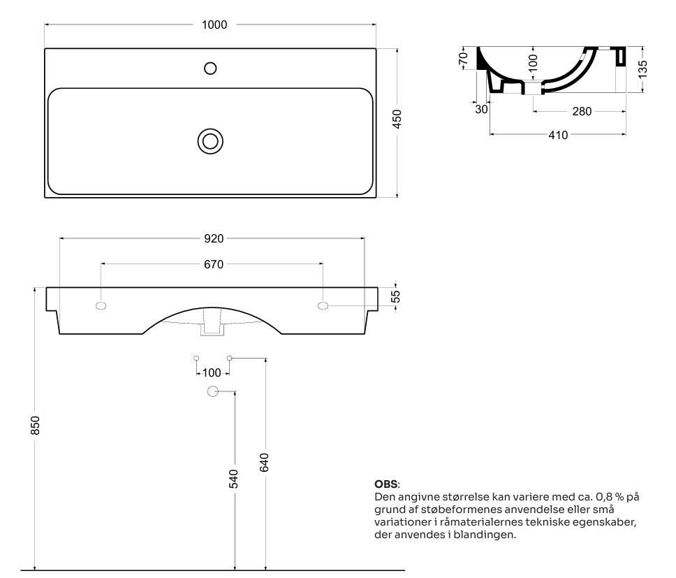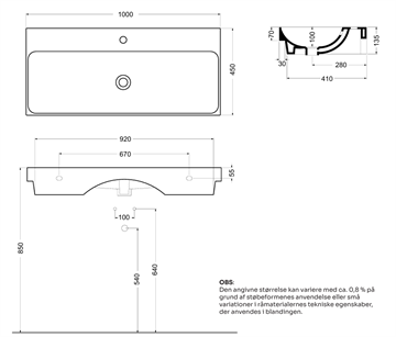 Lavabo 100 håndvask 100 x 45 cm m/hanehul, hvid