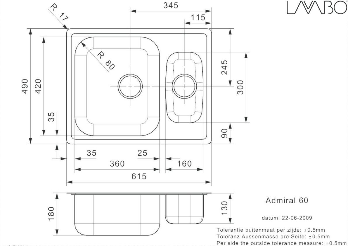 Lavabo ADMIRAL 60 (L) KGOKG 1½ kumme køkkenvask i rustfrit stål