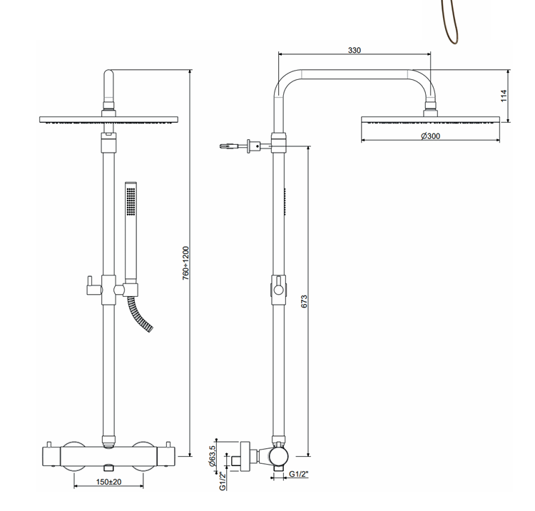 Den lodrette bruserstang er justerbar i højden fra min 80cm til max. 120 cm.