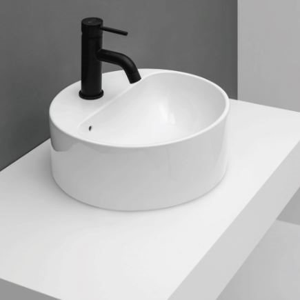 Lavabo AXA Rondo porcelænsvasken har et elegant og stilfuldt rundt design. Vasken er til placering ovenpå en bordplade og leveres med hanehul og overløb.