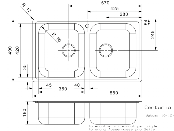 Lavabo Centurio 10 køkkenvask 85 x 49 cm med 2 bassiner i rustfrit stål