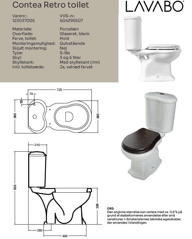 Lavabo Retro gulvstående toilet med S-lås (det vil sige, hvor afløbet går lodret ned i gulvet).Og softclose toiletsæde i valnød træfinish