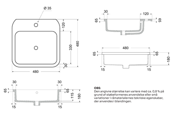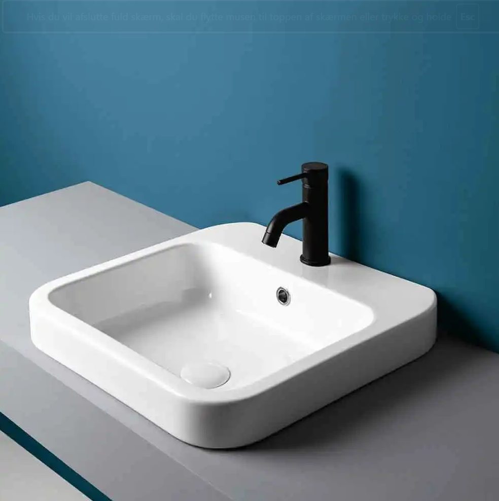 Lavabo Cosa 48 indbygget håndvask 48 x 48 cm m/hanehul, hvid m/hanehul, hvid til nedfældning i bordpladen. Flangen vil være ca. 65 mm over bordpladen.