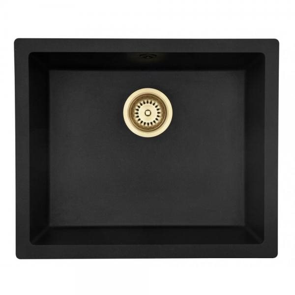 Lavabo Jupiter 600 Køkkenvask uden hanehul i sort komposit materiale og med messing/Guld kurveventil. En flot og stilfuld køkkenvask i eksklusivt italiensk design.