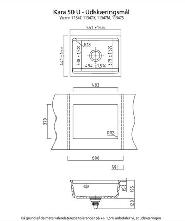 Lavabo Kara 50 U Køkkenvask 551 x 441 x 200 mm i matsort keramik med krom kurveventil til underlimning. art.nr. 11347