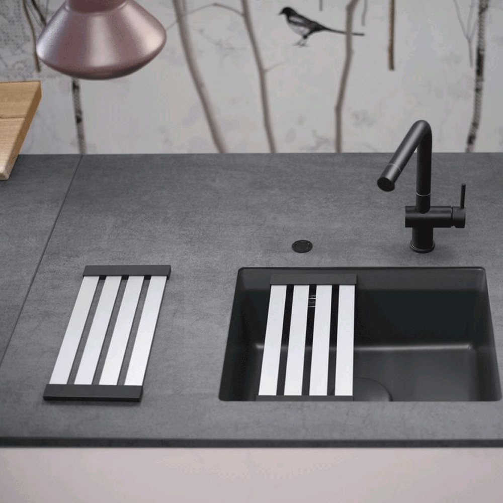De skrå kanter er designet til placering af den praktiske afsætningsrist 16003 (tilkøbsprodukt), som er ideelt til afdrypning af opvasken, eller sæt gryden på risten mens du fylder den med vand.