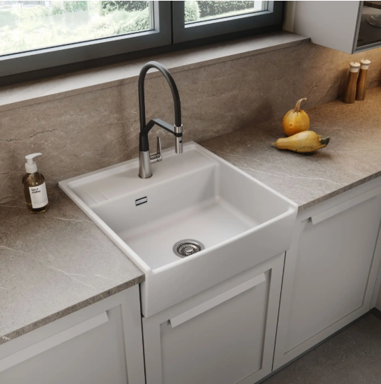 Gør din køkkenindretning komplet med en stilfuld og slidstærk keramisk vask, der forener skønhed og funktion i ét.