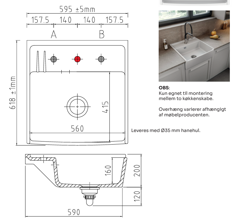 Lavabo Kentro 60 køkkenvask 595 x 618mm i hvid porcelæn til modul m/messing bundventil
