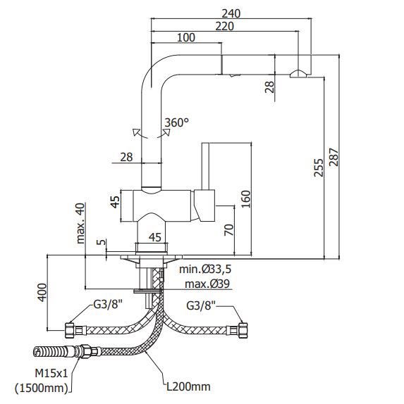 - Fleksible tilslutning med 3/8" omløber for let montering
