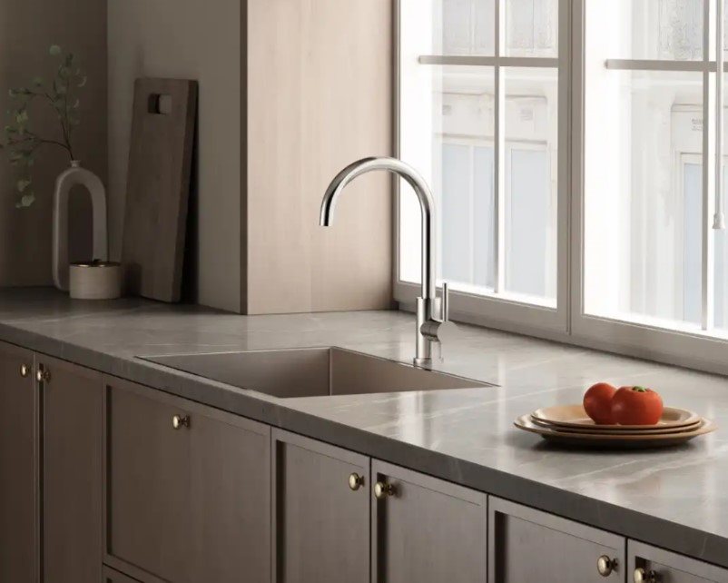 Kubus 140 RS Round, køkkenvandhanen har et moderne og stilrent design med skandinavisk appel. Vandhanen byder på fine detaljer med sine runde og afbalancerede former. Det brugervenlige greb og den høje 180° svingbare C-tud, giver masser af komfort, når opgaverne ved køkkenvasken skal løses.