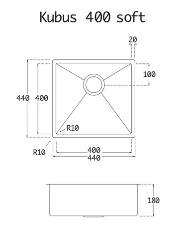 Køkkenvask er uden hanehul i moderne firkantet design. De indvendige runde hjørner følger vaskens yderkant, hvilket giver et harmonisk design, ligeledes er de indvendige runde hjørner rengøringsvenlige. Kuvertbunden betyder, at vandet nemt løber i afløbet.