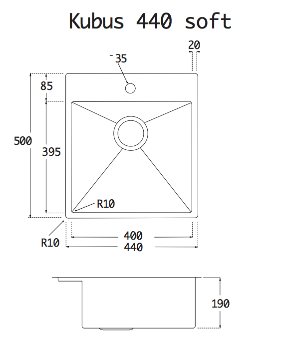 Lavabo Kubus 440 Soft Køkkenvask i rustfrit stål med manuel kurveventil samt hanehul og overløbshul.