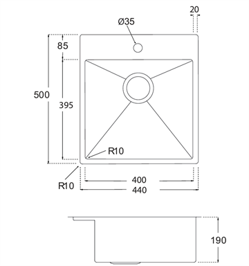 De afrundede hjørner (R10) giver et moderne og harmonisk udtryk, men gør samtidig vasken mere rengøringsvenligt og hygiejnisk, da det minimere ophobning af snavs. Flot kvadratisk vask med optimal udnyttelse af pladsen, som derfor er velegnet til køkkenet, hvor pladsen er trang.