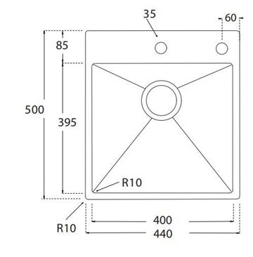 De afrundede hjørner (R10) giver et moderne og harmonisk udtryk, men gør samtidig vasken mere rengøringsvenligt og hygiejnisk, da det minimere ophobning af snavs. Flot kvadratisk vask med optimal udnyttelse af pladsen, som derfor er velegnet til køkkenet, hvor pladsen er trang.