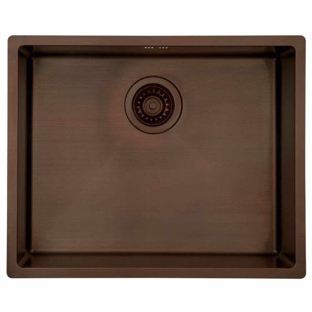 Lavabo Kubus 500 soft køkkenvask i bruneret massiv messing med manuel strainer og overløbshul.