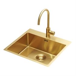 Lavabo Kubus 540 soft køkkenvask i Guld/sand (PVD) med hanehul og overløbshul. Størrelsen gør køkkenvasken yderst anvendelig, selv i et køkken med mindre plads til en køkkenvask.