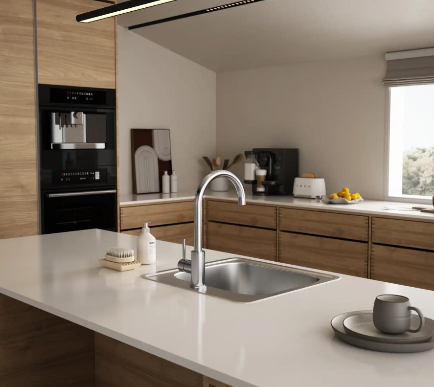 Ved nedfældning udfræses der et hul i bordpladen, hvorefter vasken bliver monteret oppefra og ned i bordpladen. Du vil derfor opleve en lille kant mellem køkkenvasken og bordpladen.