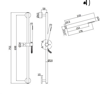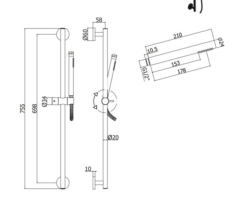 Den 698 mm brusestang er til vægmontering. Håndbruseren kan let indstilles til den ønskede højde med den forskydelige holder.