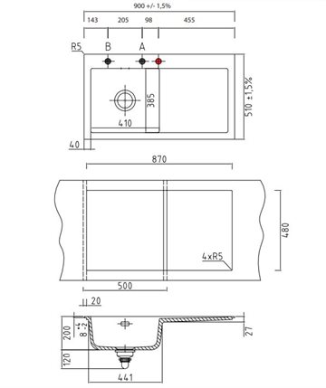 Lavabo Mera 90 porcelæn Køkkenvask 90 x 51 cm - Vask til venstre, Nedfældning