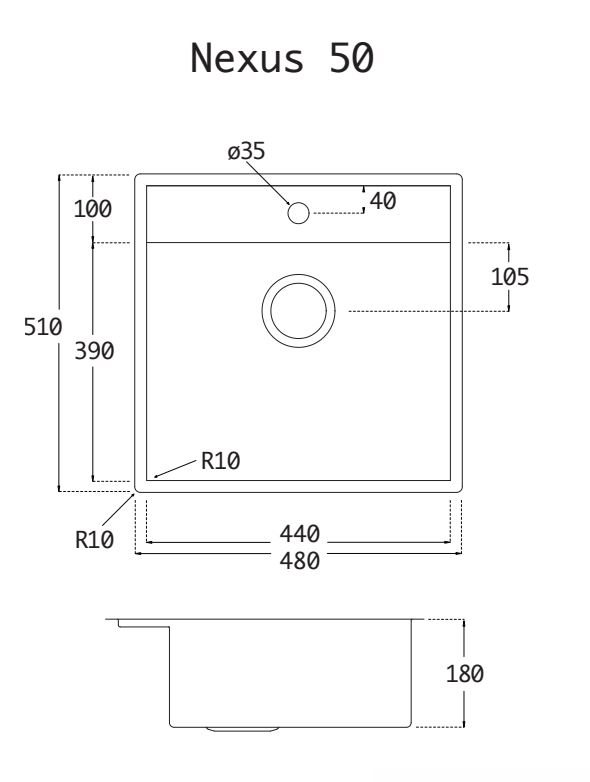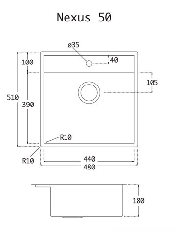 Lavabo NEXUS 50 Køkkenvask 48 x 51 cm i Rustfrit stål med hanehul og overløb