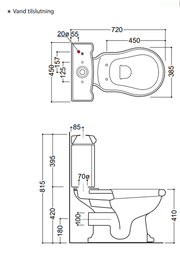 Lavabo Retro Monoblocco gulvmonteret toilet med P-lås (det vil sige, at det kan bruges hvor afløbet går lodret ned i gulvet eller vandret ind i væggen). Afgangsbøjning er tilkøb.