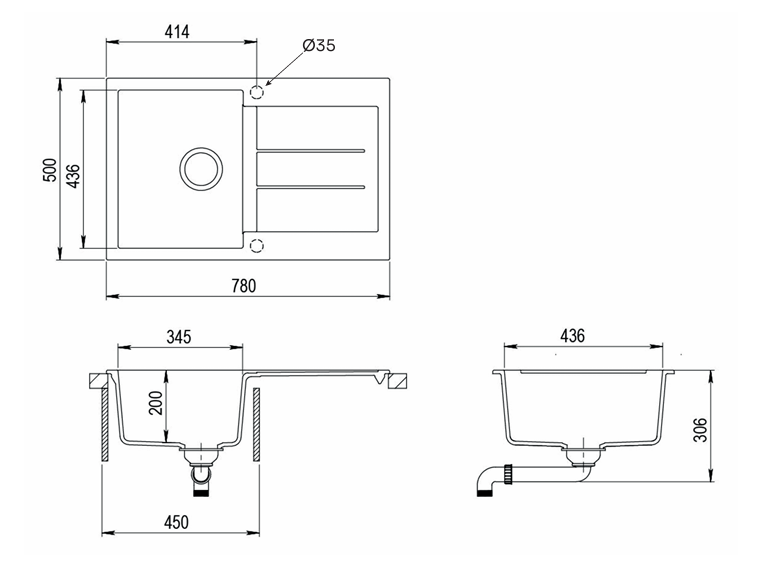 Lavabo Saturn 780 Køkkenvask 78x50cm med sidebakke m/krom kurveventil, Nedfældning