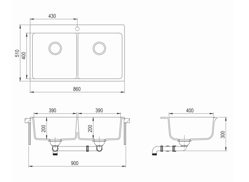 Lavabo Saturn 86 dobbelt Køkkenvask 86x51cm m/kobber kurveventil, Nedfældning