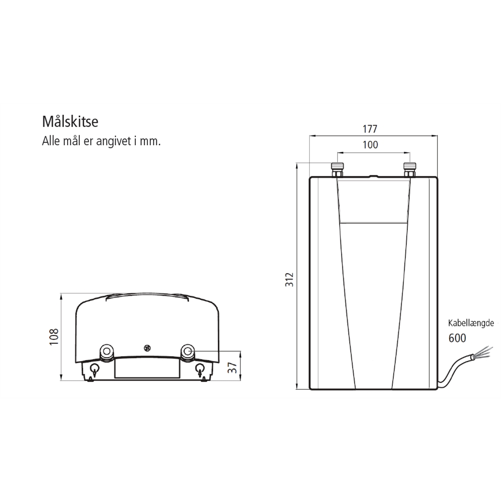 Tilsluttes 230 volt og yder 3,5 kW. Tilsluttes 3x400 volt og yder 11 KW. Sikres med en 3x16A sikring. Velegnet til håndvask med eksisterende trykarmatur. Vandvarmeren skal monteres med rør op.