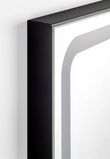 Dette rektangulært spejl har rene linjer, der passer perfekt på enhver væg. Spejlet har en diskret matsorte aluminiumsramme på 26 mm i dybden, der på smukkeste vis indrammer spejlet. Den hvide sandblæste kant på fronten af spejlet, tillader lyset at komme igennem, hvilket giver jævnt et lys for beskueren og stråler ud i rummet.