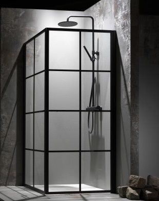 NEW YORK brusehjørne 78,5 x 98,5, 2 døre i 6 mm klart hærdet sikkerhedsglas med sort ramme & sprosser