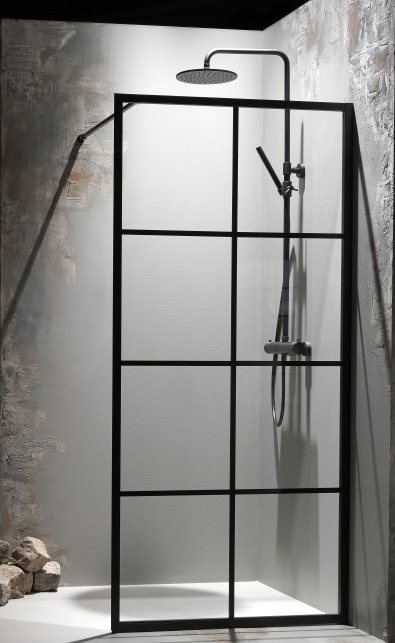 Stilfuld brusevæg udført i klart glas med sort ramme og sprosser samt støttestang.