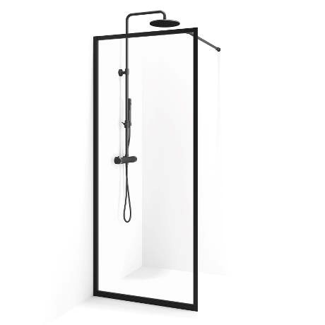 Stilfuld brusevæg udført i klart glas med sort ramme samt støttestang.