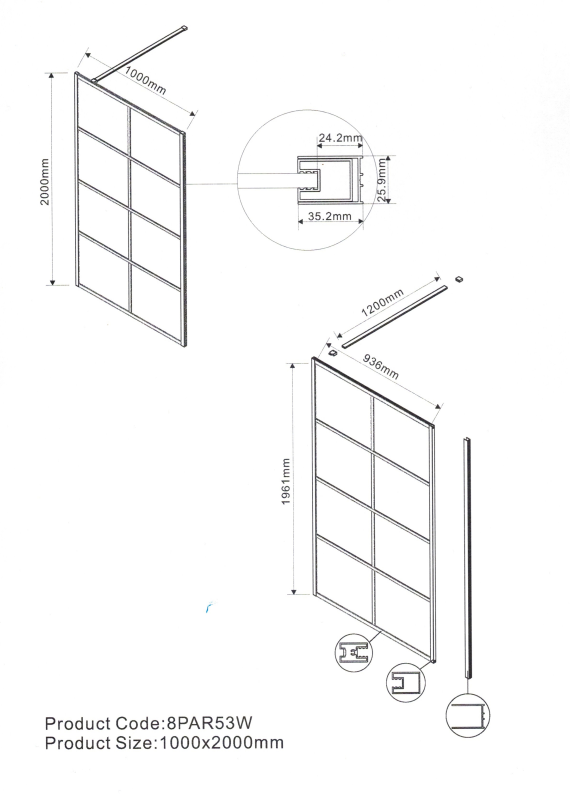 Denne faste bruseafskærmning i mat sort med sprosser er 100 cm bred og 200 cm høj.