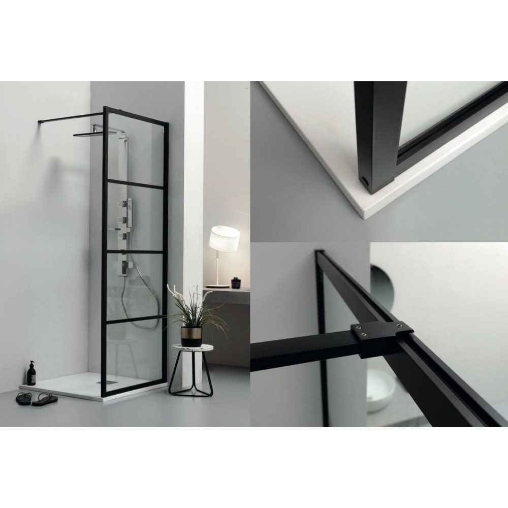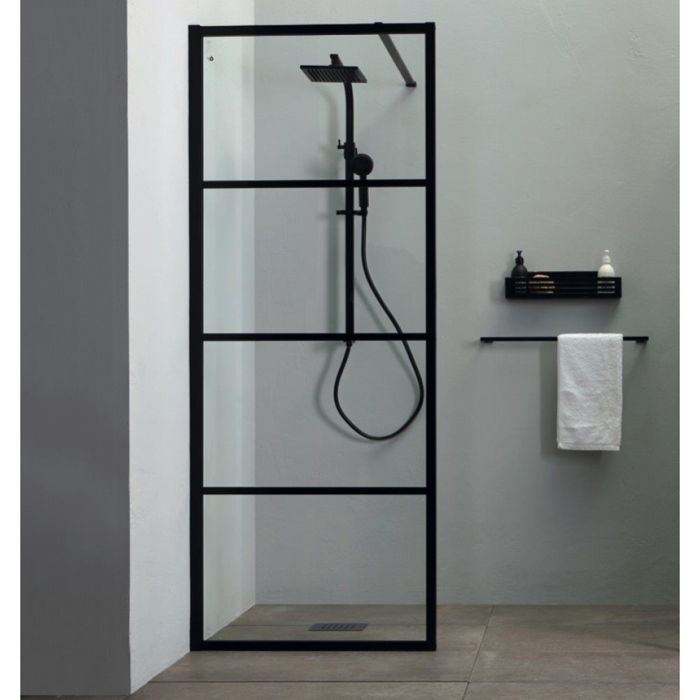 Denne faste bruseafskærmning i mat sort med sprosser er 90 cm bred og 200 cm høj.