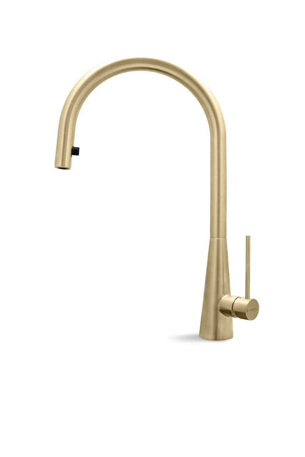 Newform Conico køkkenarmatur med udtræk i C-tuden - i børstet messing PVD. Den totale højde på køkken vandhanen er højden 414mm og udtrækket er skjult indvendigt i tuden.