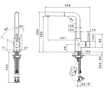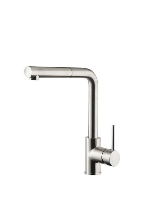 Køkkenbatteriet har udtræksslange, der gør rengøring af køkkenvasken lettere og generelt arbejdsgangen lettere ved påfyldning af gryder med vand. Den L-formede udløbstud er svingbar, og utrolig elegant med sit enkle udtryk.