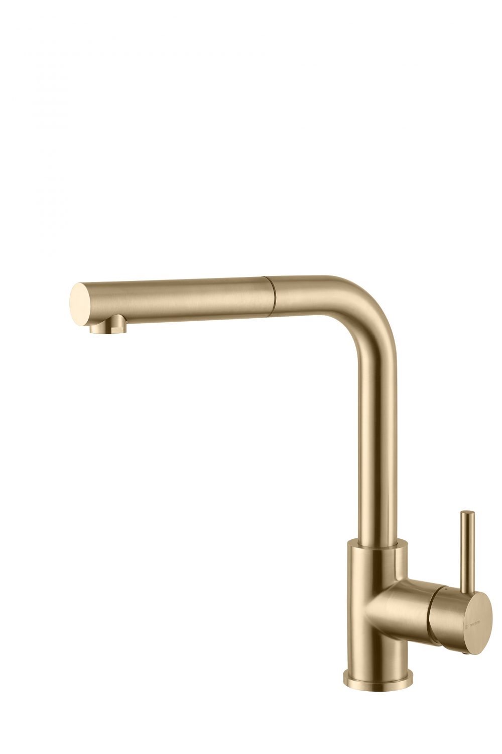 Newform X-Trend 1-grebs køkkenarmatur med stilren L-tud og udtræksbruser i Børstet messing, art.nr. 63425,59,098