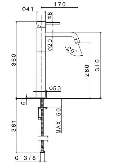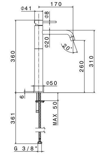 Vandhanes total højde er 360 mm og tudens længde (fremspring) er 170 mm