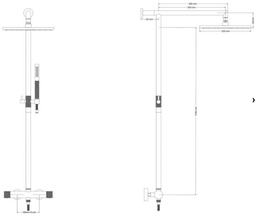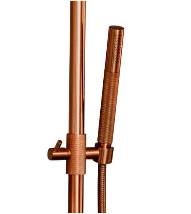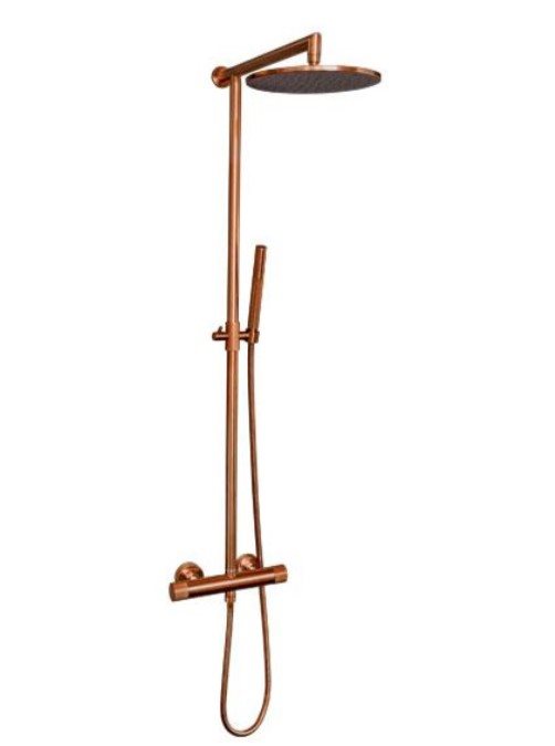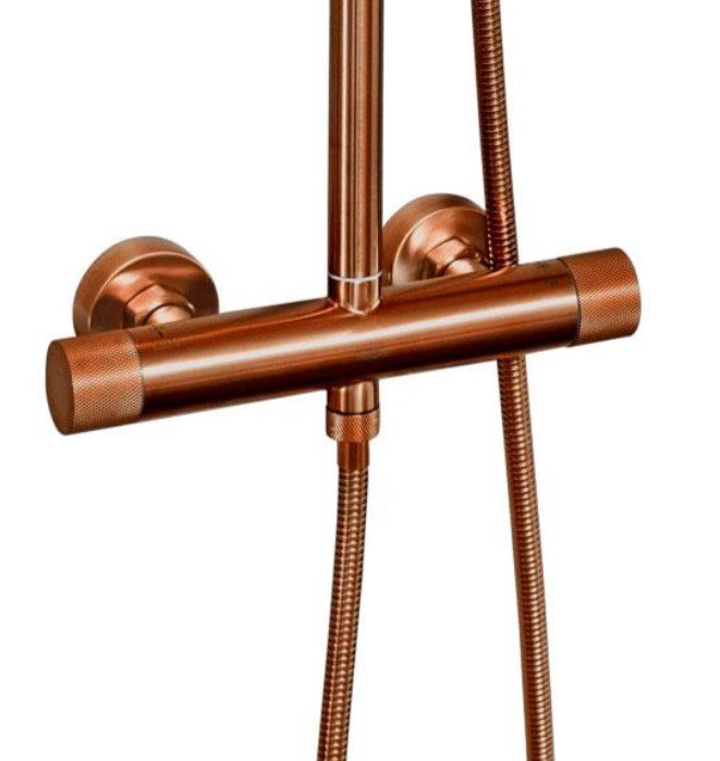 Komplet Noba brusesystem med termostat reguleret armatur samt stor hovedbruser og elegant slimline håndbruser i børstet kobber