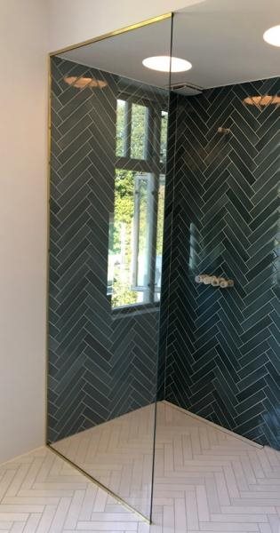 Nordic brusevæg på mål 900 x 2000 mm, klart glas 8 mm - messing u-profil