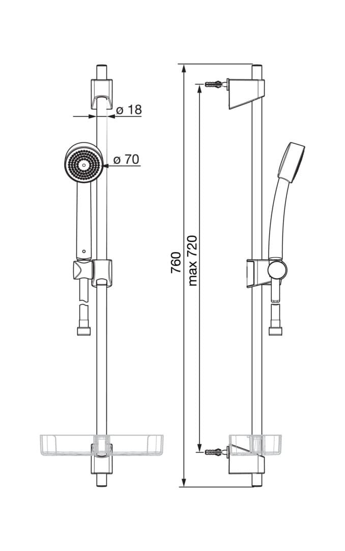 Oras Apollo brusersæt Ø 70 mm håndbruser med anti-kalk funktion, 1 stråletype, justerbar bruserstang max. 720 mm, 1500 mm bruserslange og sæbeskål. Forkromet.