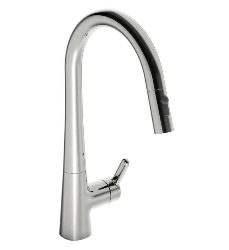 Køkkenarmatur er med en høj udtræksbar tud med mulighed for, at skifte mellem spraystråle og spulestråle.