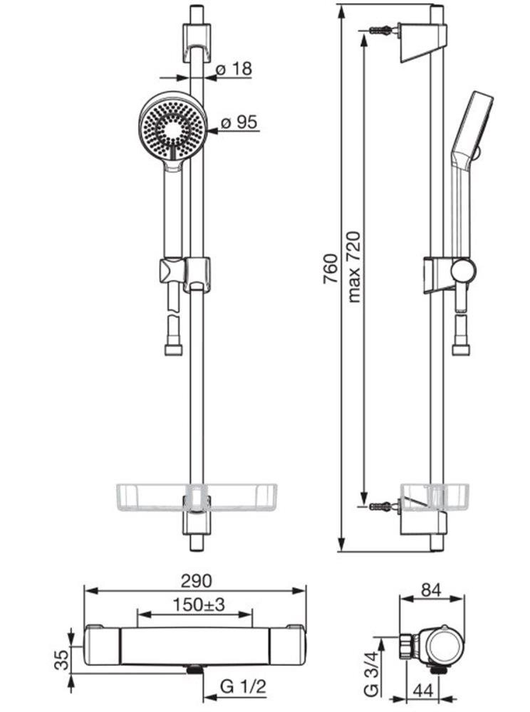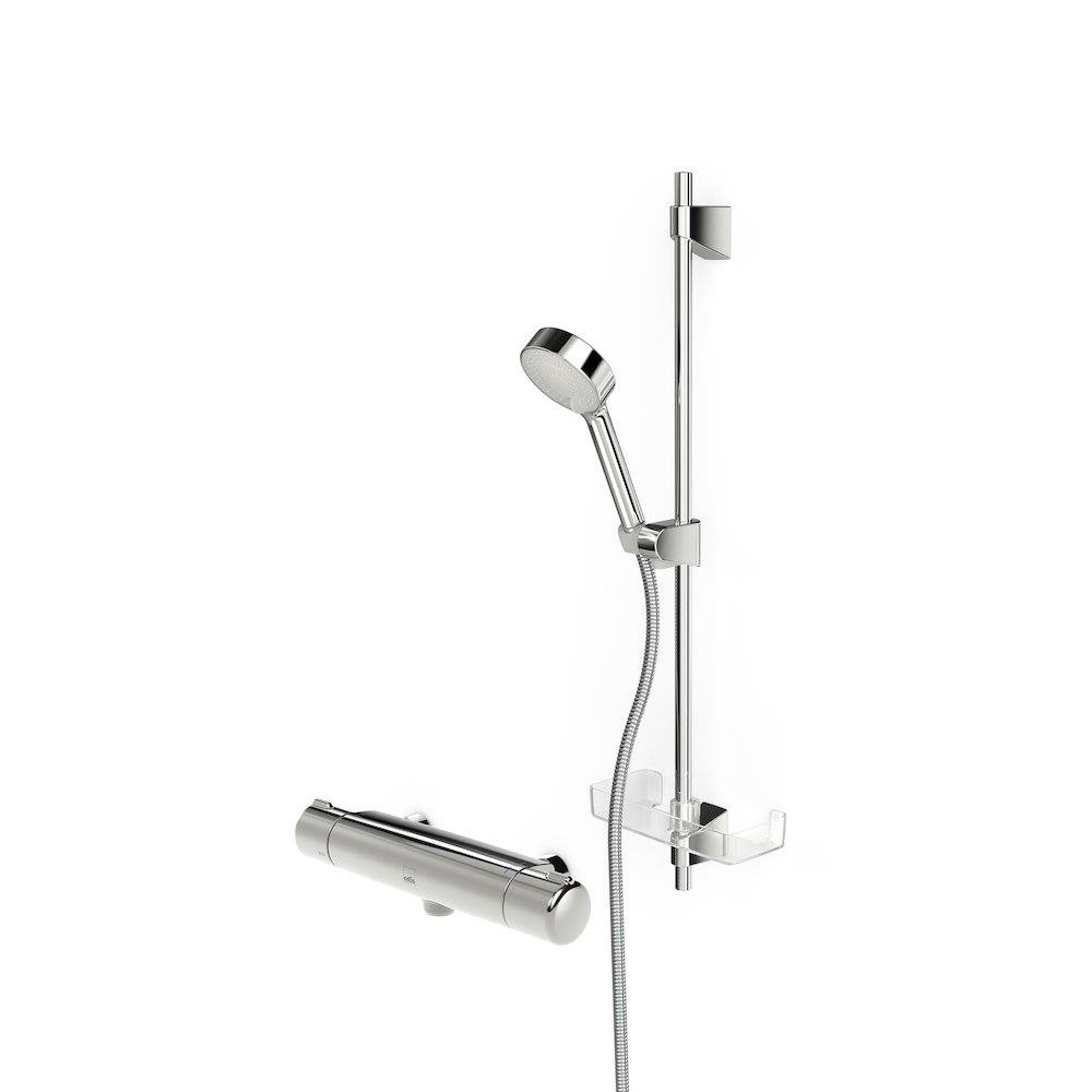 Samlet sæt med termostatisk brusearmatur, hvor temperaturreguleringen er udstyret med skoldningssikring ved 38°C. Mængdereguleringen er udstyret med EcoFlow. Armaturet leveres med trykudligner, smudsfiltre og kontraventiler. Oras Apollo brusesæt inklusiv håndbruser med 3 strålefunktioner (inkl. EcoFlow), 760 mm justerbar brusestang, sæbeskål og 1750 mm bruseslange.