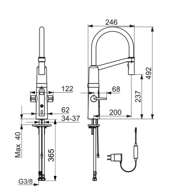 Svingradius er 120° som standard (kan begrænses til 60° eller 80°). Den berøringsfri funktion aktiveres ved, at holde hænderne indenfor sensorområdet. Vandtemperaturen på den berøringsfri funktion justeres ved, at dreje ringen mellem armaturet om svingtuden. Fast strømforsyning med stikproptransformer 230/ 5 V. F = fleksible tilslutningsslanger,