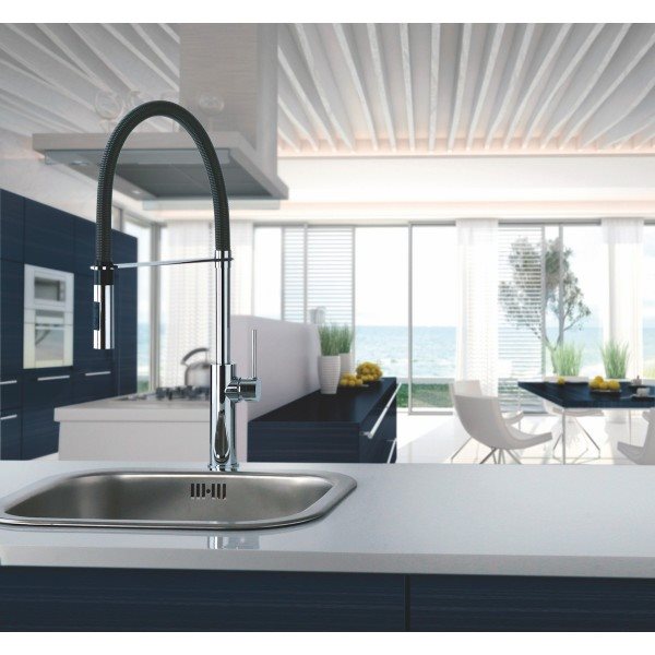 Denne vandhane har udtrækstud for enden af den sorte fjeder slange,  og på udtrækstudens kan der veksles mellem to spraystråler. Det stilrene design har industrielle undertoner og en perfekt form, der aldrig går af mode.