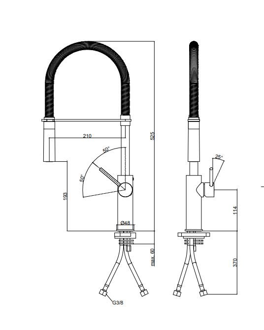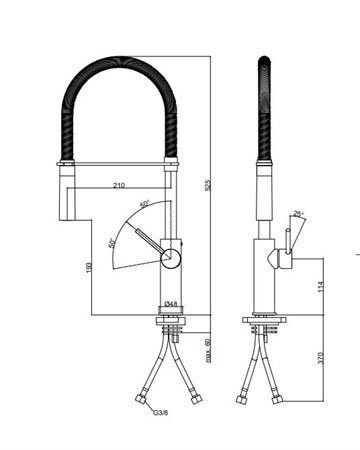 Denne vandhane har udtrækstud for enden af den sorte fjeder slange,  og på udtrækstudens kan der veksles mellem to spraystråler. Det stilrene design har industrielle undertoner og en perfekt form, der aldrig går af mode.