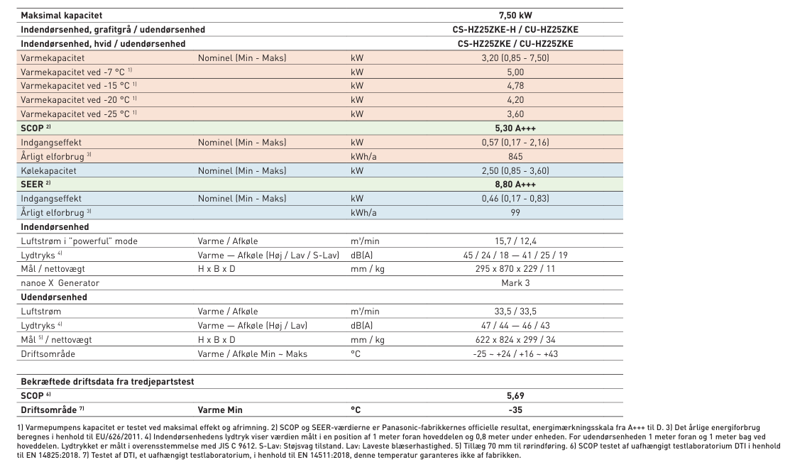 Lydtryks 4) Varme — Afkøle (Høj / Lav / S-Lav) dB(A) 45 / 24 / 18 — 41 / 25 / 19